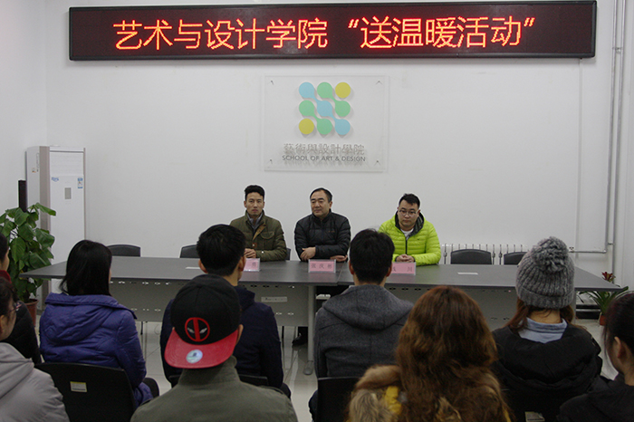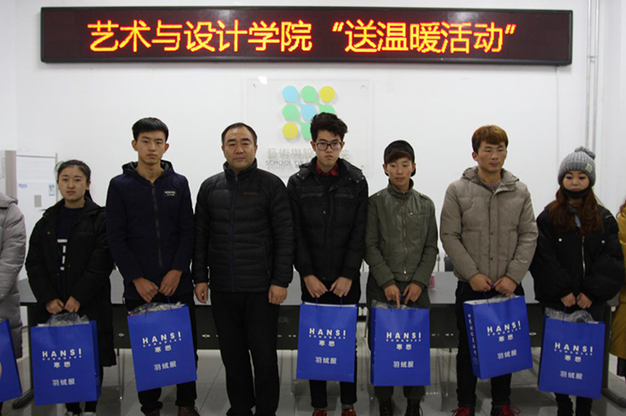 首先,张庆彬书记代表艺术与设计学院向学院贫困家庭学生表达了学院对他们的关心,同时向本院贫困学生送去了来自冬日的温暖——羽绒服和回家的往返车票。张书记提到,无论同学们遇到什么难题,学院永远都是他们坚强的后盾。