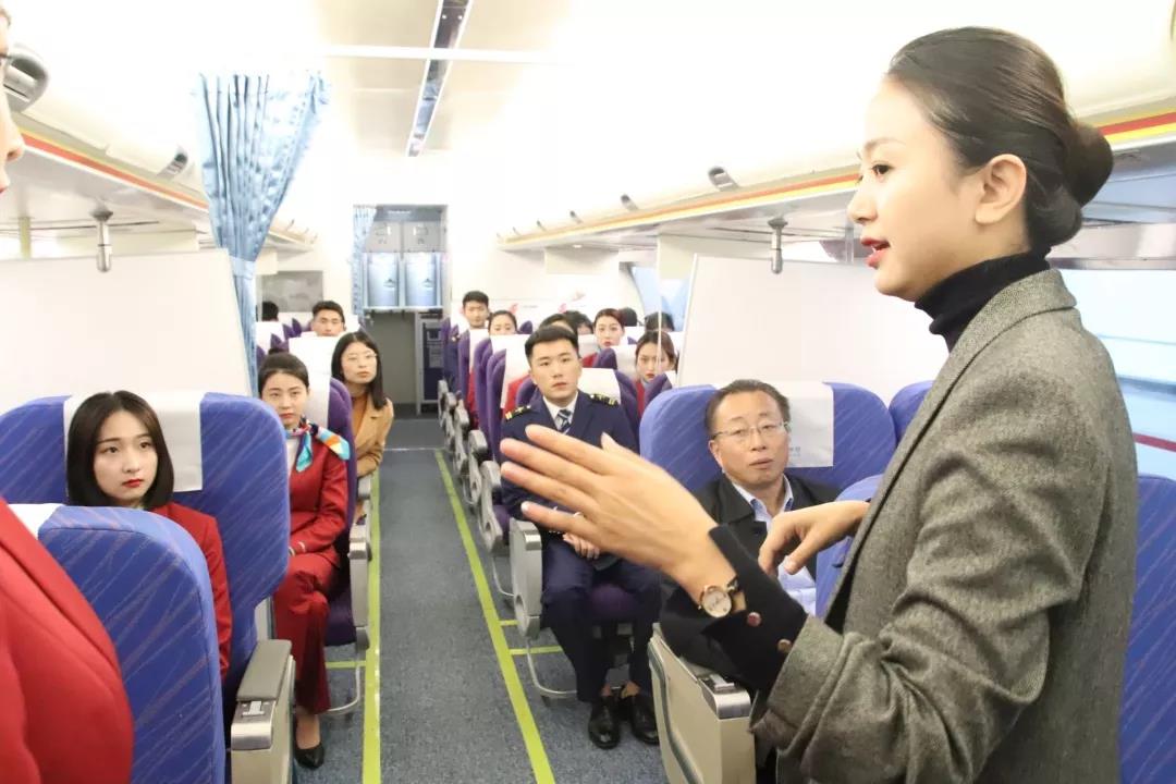 在学生们的邀请下,唐书记参观了乘务实训模拟舱,听李媛冉老师讲授了《客机氧气罩使用》一课,并体验了乘务学生服务流程模拟。