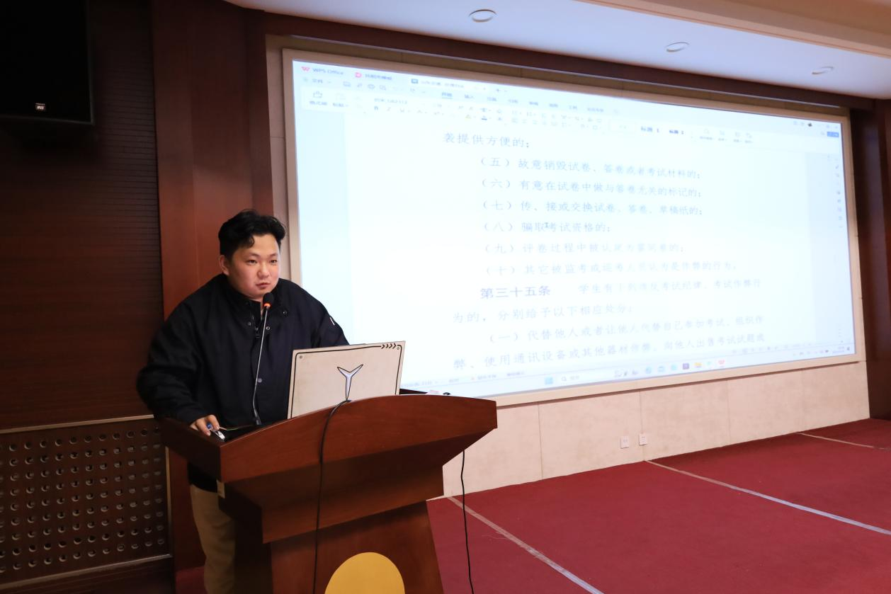 学生会主席王一凡向新生详细解读了学院的学生综合素质测评办法,同时根据综合测评介绍了评奖评优的条件和要求,并且重点讲述了学院志愿服务和社会实践方面的加分政策,引导大家德、智、体、美、劳全面发展。王一凡提醒同学们,综合测评关系到学院每一位同学的切身利益,与学生的奖惩评优直接挂钩,同学们必须高度重视。