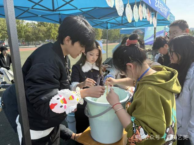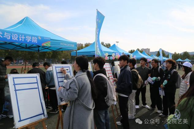 刚走进操场,一片错落的蓝色帐篷便撞入眼帘,艺术与设计学院的展区就藏在这片“蓝色海洋”里,却自带让人忍不住驻足的魔力。展区被精心划分成多个体验区,每一处都藏着巧思——把专业的艺术素养,揉进了轻松有趣的互动里,让每个人都能亲手触摸“美”的模样。