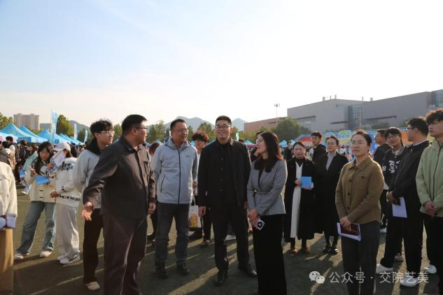游园会期间,领导和老师们也循着热闹走进了这片蓝色帐篷区,一踏入就被浓厚的艺术氛围打动。在漆扇创作区,他们驻足许久,看着同学们专注调色、晕染的模样,轻声询问创作灵感,还温柔鼓励道:“要把课堂上学到的知识,和生活里的美学结合起来,让艺术真正走进生活、服务生活。”