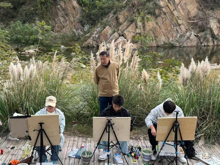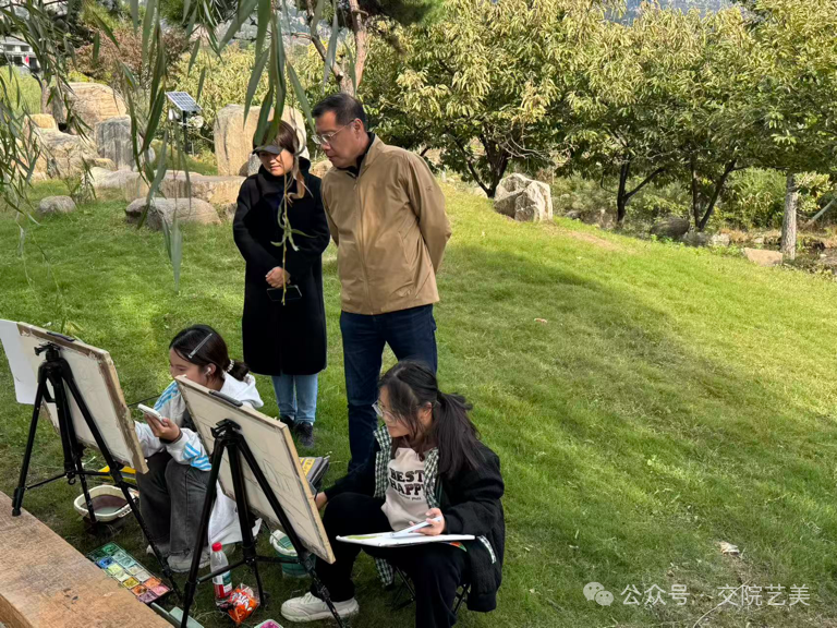 在户外写生现场,慰问团走近画架,欣赏作品、交流创作思路,询问写生进度与难题,鼓励大家善用自然资源、大胆创作,并提醒做好户外安全与保暖防护。