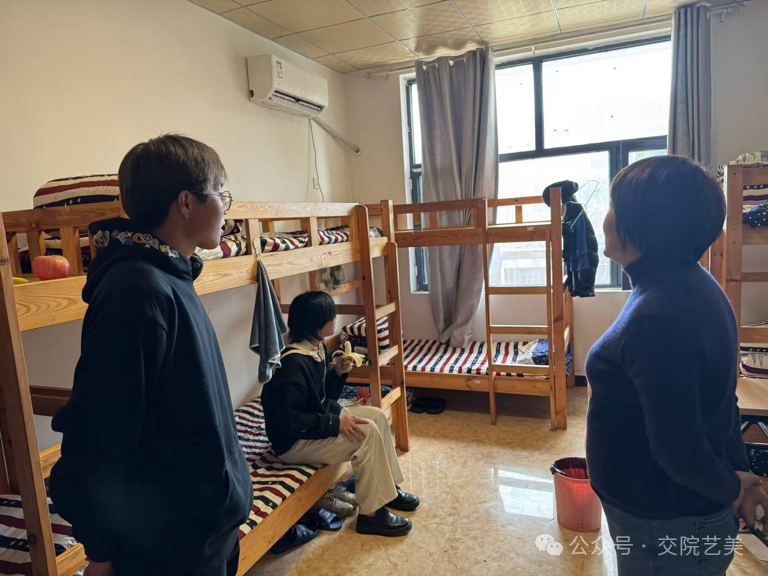随后,慰问团走进学生宿舍,细致查看住宿条件与卫生状况,肯定同学们良好生活习惯,同时叮嘱注意用电安全、保证充足休息,以饱满精神投入创作。