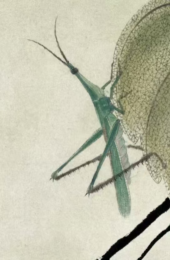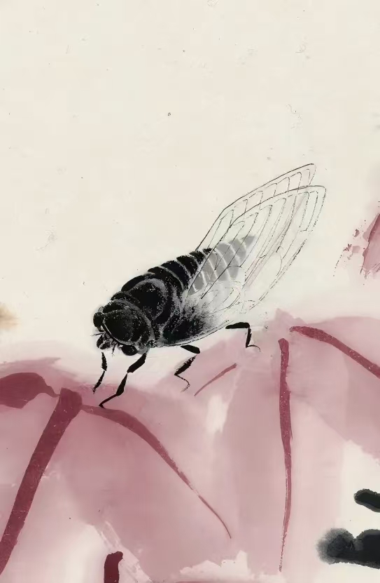 他将置于荷花上的蝉、树叶上的蚂蚱描绘出来