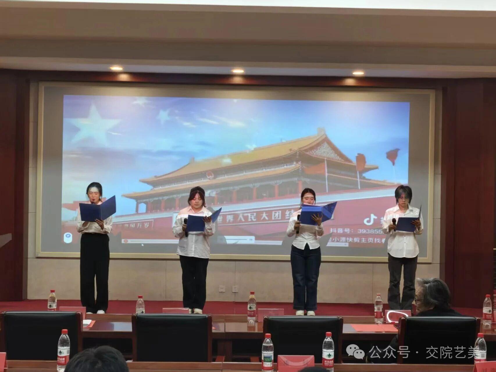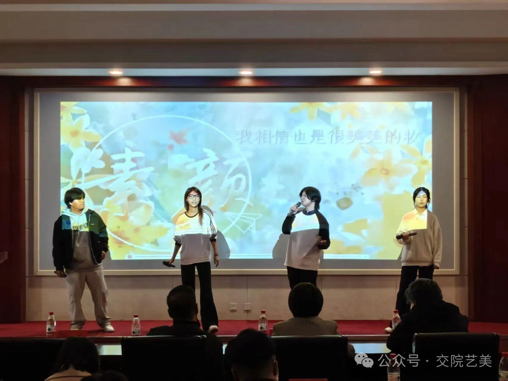 典礼还穿插多个节目表演环节。一段舞蹈《布袋舞》迅速点燃全场氛围;歌曲《素颜》与舞台剧《七秩传薪・向东而行》相继上演,既传递出青春活力,也彰显了交院精神。进入典礼后半程,歌曲《找自己》《爱我还是他》、舞蹈《山楂树之恋》及朗诵《这盛世如你所愿》接连呈现,为整场典礼画上圆满句号。