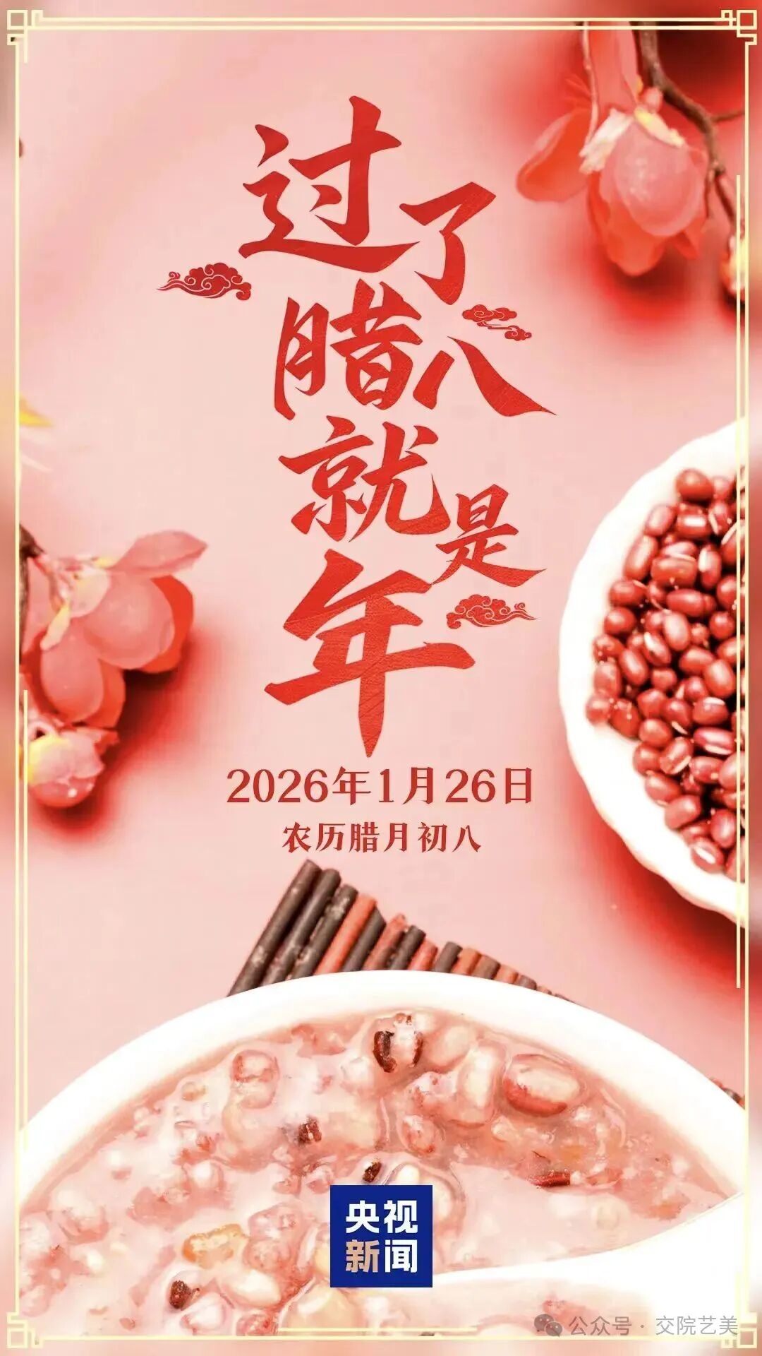【2026-01-26 点击:次 编辑:王华玮 】腊八节 农历十二月初八,是春节的前奏 人们往往会在腊八这一天 熬腊八粥、泡腊八蒜 食俗暖融融,寓意五谷丰登 以祈岁岁平安、来年顺遂 “小孩小孩你别馋,过了腊八就是年” 这句耳熟能详的童谣 寄托了百姓对新的一年的期待与生活的热爱 腊八启新岁,粥香迎新春 祝大家 马到成功,诸事顺意 策马扬鞭,岁岁安康