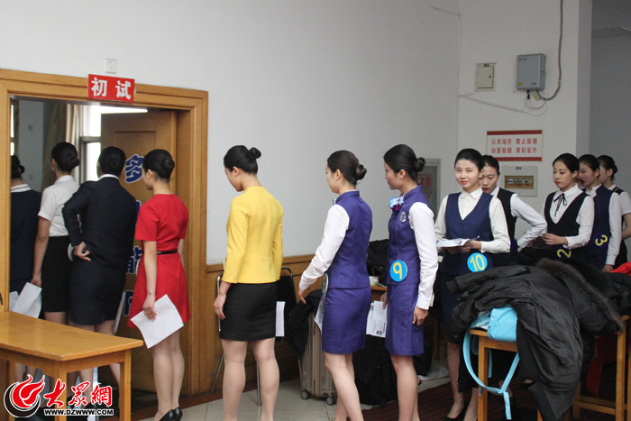 28日上午8点,大众网记者来到山东交通学院无影山校区,考生们在初试考场外已经排起了长队,等待分组编号进入考场。在考场内,每10名考生一组,按照工作人员的语音提示进行着转体、微笑、坐姿等形体展示,3位专业评委现场不时的对考生进行指导和抽查。