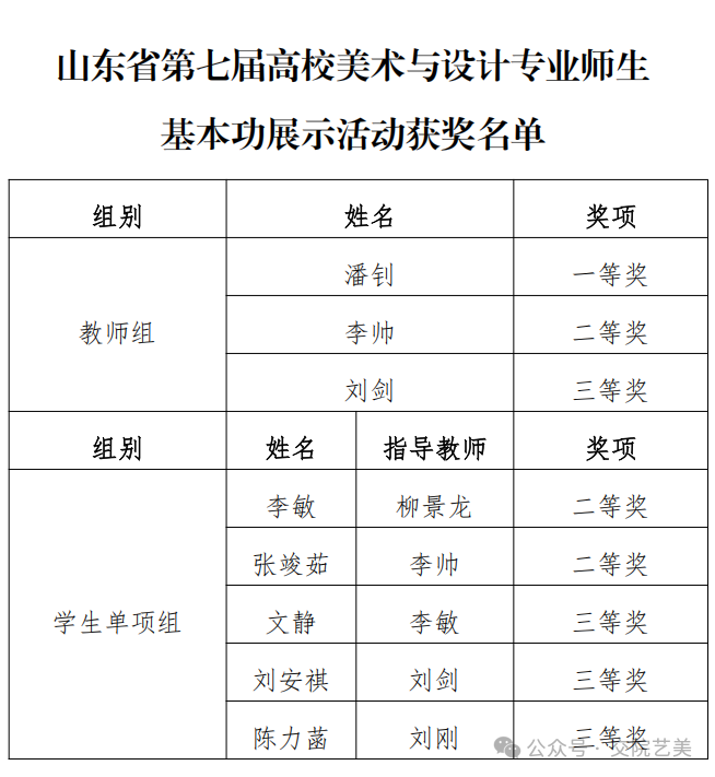 【2025-12-14 点击:次 编辑:陈伟青 】 近日,由山东省教育厅主办,山东工艺美术学院承办的山东省第七届高校美术与设计专业师生基本功展示活动获奖名单公布。我院师生共获得一等奖1项,二等奖3项,三等奖4项。